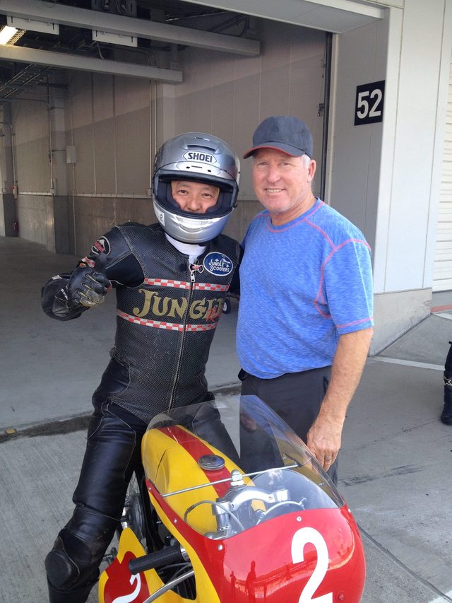 去る5月23、24日に、三重県・鈴鹿サーキットで開催された「SUZUKA Sound of ENGINE 2015」に行ってきました。通常、雑誌編集者としての私の場合、鈴鹿に行くのは雑誌記事の取材・・・というのが常ですが、今回は場内放送のコメンタリー(解説)という初体験のお仕事・・・でした。「SUZUKA Sound of ENGINE 2015」は、2輪・4輪のモータースポーツを彩った名機と名選手をメインにフィーチャーする、日本版"グッドウッド"を目指して企画されたイベントです。"グッドウッド"については、こちらのWikipediaをご参照ください。大雑把に言えば、「葵祭」や「流鏑馬」のように、その国の歴史や文化を振り返る祭りの、自動車文化@欧州・・・みたいなものです(ちなみに秋のグッドウッドでは、「リバイバルミーティング」という、ロードレース形式のイベントも開催されています)。世界で五指に入る? 超一流クラシック系モータージャーナリスト(笑)の私は、過去に何度か"グッドウッド"に遊び or 取材で訪問していますが、"グッドウッド"の面白いところは、いわゆるモータースポーツファンだけではなく、ニット編みが趣味・・・みたいなお婆ちゃん、そして普段はヒップホップを聴いているであろうナウいヤング(死語)など、いつもはモータースポーツに関係なさげな人たちまでがそこに集い、「Lovely・・・」(意訳:ステキ!)と呟きながら、2輪・4輪の名レーシングマシンの疾走する姿を見ているのです。「葵祭」とか「流鏑馬」に例えたのは、つまり彼ら(英国人・欧州人)にとっては、2輪・4輪といった機械文明が、自国の誇るべき歴史・文化という認識が共通意識としてあるのではないか・・・という推論からです。そういうものに注ぐ「あたたかい目」が、彼らにはあるのではないか、と私は確信に近く思うのであります。日本も第二次大戦後から約70年とか経ちますが、戦後から今日までの、日本が経済大国になるまでの過程でそのエンジン役のひとつを果たしたのは2輪・4輪産業に他なりません。2輪・4輪技術の発展なくして国の発展なし・・・将来私が政治家になって、文科省の大臣になった暁には、愛国心ならぬ「愛モーター心」を育む教育を全国民に授けたいと思います。みなさま、清き一票をお願いいたします(笑)。キングケニーは日本車育ち長い前置きはそれくらいにして、本題に移りましょう。観衆の主な興味の対象であるイベントの主役は華やかなワークスマシンとレジェンドライダー/ドライバーですが、それ以外のヒストリックロードレーサーオーナーの趣味人たちも参加していました。1966年ブリヂストン90にまたがるジャングルスクーターズ店主の古田さん(左)と、3度世界GP王者になったキングことケニー・ロバーツ。イベント開始前日の22日(金)は、本番に向けての練習走行が行われました。紆余曲折があり? 今回2輪の一般参加はわずか5台・・・という寂しい内容でした。もっと多くのヒストリックロードレーサーオーナーに参加してもらえるように、主催者には彼らの想いをくんだ上で、ひと工夫ふた工夫を考えていただきたいものですね。そんな一般参加者たちのピット内に、金曜日の午後どよめきが起こりました。"キングケニー"ことケニー・ロバーツがピットに訪問し、参加車両各車に慈しみの眼差しを注いでいたのです。話を聞いてみると・・・「私が初めて乗ったバイクは、トーハツの50ccなんだよ。スズキX6ハスラー(注:日本国内市場の2ストローク250ccツイン・6速のT20系)のエンジンを使ったハーフマイルのダートトラッカーにも乗っていたんだよ」。ヤマハのファクトリーバイクであるYZR500を駆り、1978〜1980年の世界ロードレースGP500ccクラス王者となったケニーさんは、日本車でノービス期を過ごし、ライディングのなんたるかを学んだのです。24日(日)に、カワサキのGP500ccマシン、KR500(1981年型)に乗るケニーさん。アメリカ人ライダーの世界ロードレースGPでの活躍=アメリカン・インベーションの代表であるグレートチャンピオンが、日本車で育ったということは、日本人のひとりとして非常に嬉しいことですね。なおカワサキKR500を今回鈴鹿に持ち込んだ英国人オーナー、クリスさんのはからいで、ケニーは現役当時ライバルとして戦ったマシンにライディングしたのですが、「ポジションが合わなくて怖い」と数周でピットインしました。あくまでデモンストレーション走行なのだから、安全第一でタラ〜っと走ればいいのに、とも思いましたが、そこはやはり"生粋のレーサー"なのでしょう。100%で走れないならば走らない・・・と言わんばかりの振る舞いに、キングのキングたるゆえん、を感じた次第です(続く)。