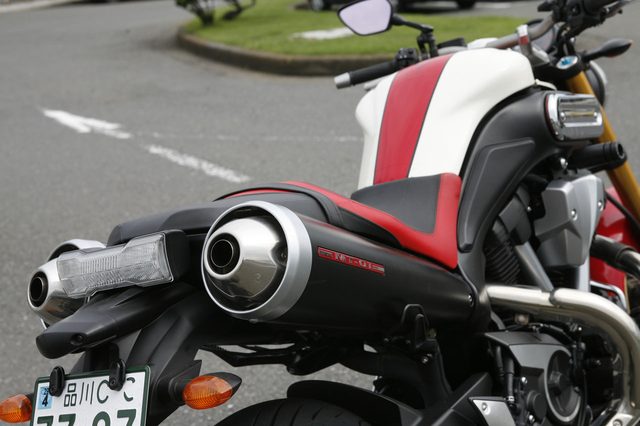 YAMAHA MT-01。ずっと気になっていたバイクだ。1999年にモーターショーで「鼓動」をテーマにコンセプトモデルとして発表され、ほぼ同じ姿で2005年から2009年まで販売されたヤマハのスポーツバイク。XV1700というハーレーに対抗するかのようなアメリカンバイクの、1,670cc空冷V型2気筒エンジンを、ネイキッドスポーツの車体に搭載したという異色なマシンで、「あれってどんなバイクなの?」って思っていた方も多いと思う。ヤマハのラインナップからはずれて、すでに5年以上が経つが、いまだに世界でもあまり類をみない、ユニークな構成を持ったMT-01に試乗する機会があったのでレポートしてみたい。アメリカンバイクのエンジンをつんだスポーツバイクなんといっても最大の特徴は、スポーツバイクでは例のないこの巨大なエンジンでしょう。空冷V型2気筒エンジンの夾角は48°で、ハーレーの45°にかなり近い。北米市場をにらんだアメリカンバイクのXV1700をベースにしているこのエンジンは、最高出力を4,750rpmで発生させるという、まさにアメリカンな出力特性を持っているが、実際にはXV1700のエンジンから90%近い部品が見直されているというから、別物のエンジンと行ってもいいほどの変更がなされているようだ。他にはない異次元のライディングフィールまるでエンジンがフレームやタンクを背負っているかのようなMT-01は、やはりそれなりに大柄でかなりの存在感がある。そのライディングフィールはというと、もちろんこのエンジンのキャラクターそのままを味わうこととなった。5,500rpmからレッドゾーンとなっているタコメーターをにらみながら、アクセルをあけてゆくと、まさに車体全体から「鼓動」を爆発させながら加速してゆく。ハーレーのビッグツインと似たような感覚だけど、前傾のスポーツバイクのポジションがこれを異次元のものにしているのだ。5速トップ2,000rpmで走る気持ちのいいエンジン4気筒のスーパースポーツやドゥカティのLツインとはあきらかに違う加速フィーリングながら、4,750rpmという低回転で最大出力にいたるVツインエンジンは、想像以上に伸びやかで気持ちよく回り、加速中にその鼓動が振動に変化してしまうこともない。そのままポンポンとシフトを上げてゆくと、あっという間に法廷速度をはるかに超えるスピードに達してしまう。ちなみに高速道路の常用域だと、だいたい5速トップで2,000rpmを少しまわるくらい。これくらいのスピードで流していると実に気持ちいい。ドコドコと大きなピストンが爆発するパルスを感じながら、ひとたびアクセルをひねると、ドッカ〜ンと力強く加速するのだ。この感覚はやはり他では得られない、MT-01の最大の魅力となっているんだろうなぁ。ネイキッドなのにあまり走行風を感じないとはさらに特筆したいのは、MT-01の意外な整流効果だ。高速道路を走っていてすぐに気がついたのは、カウルのないネイキッドスポーツなのに、風圧をあまり感じないということだった。不思議に思って、片手で身体にあたる風圧の強弱を探ってみると、走行風が身体の正面からそれていたのだ。これはどうやら、大きなヘッドライトが正面の風をヘルメットの上方に逃がしているようだ。そしてさらに探ってみると、なんと特徴的なデザインのこのガソリンタンクのえぐれが、肩にあたる風圧も軽減してくれているようだ。どこまでも走ってゆきたいと感じさせるMT-01もちろんMT-01はカウルを持たないから風圧はそれなりに身体に受けることとなるが、ネイキッドスポーツの元祖のような私の愛車Z1000Jの場合、高速道路を巡航するのは大げさにいうと風圧と格闘するようなものなので、このMT-01の整流能力にはちょっと感動することとなった。これはロングツーリングでは疲労を少なからず軽減してくれるはずだし、おおらかなエンジンの鼓動を感じながら、どこまでも走ってゆきたいと思わせ、バイクに乗る純粋な喜びをもたらしてくれるのではないかな。細部まで造り込まれた贅沢な車体さらに細部をみてゆくと、ホントによく作り込まれていることがわかる。このハンドルポストも削り出しなのかとても美しいし、大きなエンジンを囲むフレームとスイングアームはアルミ製だ。足回りにもR1と同様のスーパースポーツと変わらない装備が多数盛り込まれているので、今回は試すことができなかったが、コーナーリング性能も期待できそうだ。また、試乗した2009年式のMT-01Sは、往年のヤマハのロードレーサーTZを思わせるカラーリングに、前後サスはオーリンズ製が装着されたスペシャルバージョンで、MT-01のユニークなキャラクターとスポーティでレーシーなムードのギャップがたまらないモデルだった。レアで個性的なマシンでバイクライフに新しい発見をこのようによく造り込まれたMT-01は、輸出専用で車両価格が150万円ほどだったが、一般的にはあまり受け入れられなかったためか、現役生活は短命に終わってしまったようだ。ただそのため、レアで他にないユ