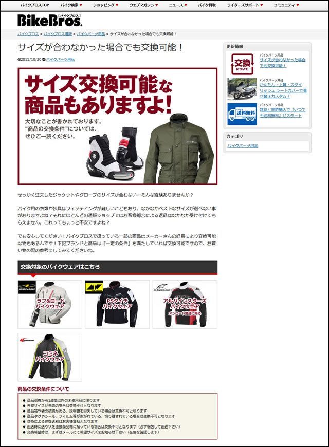 バイクブロス通販では購入後のサイズ交換への対応をスタートさせた