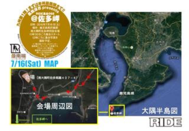 今週末、7月16日(土曜)開催のRIDE集会@佐多岬ですが、会場の詳細が決まりました。【RIDE集会068@佐多岬】日時:2016年7月16日(土)場所:鹿児島県肝属郡南大隈町佐多岬特設会場11時30分ごろ集会スタート、12時ごろに集合写真を撮影予定。*「第...