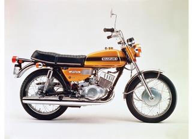 ラムエアーの冷却システムを搭載した2スト250「SUZUKI GT250」-1971年-カタログの写真は1972年型。GT250 B1あるいはGT250IIと呼ばれる。シリンダーヘッドに冷却風を集めるためのラムエアシステムを導入したのが新しい。フロントブレーキはディスク化...