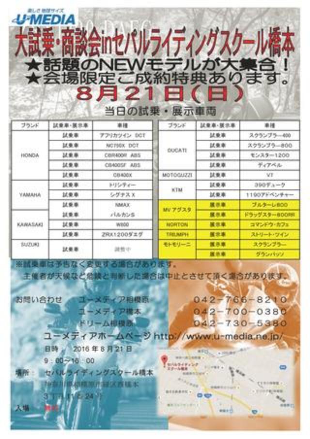 会場限定の成約特典も!新車や中古車の販売でお馴染みのU-MEDIA(ユーメディア)が、神奈川県相模原市の二輪専門教習所「セパルライディングスクール橋本」で試乗&商談会を開催します。入場は無料ですし、国産車も外国車も比較試乗するチャンスですので、この機会をお見逃しなく。...