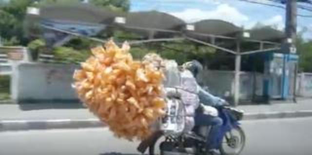 積んでます。バイクの過積載めちゃめちゃ ふわっふわ♥︎ してます。宝塚歌劇団で輝くトップスターのみが許される羽。...ではなく、タイのお父さんはお菓子を積んでいるのでしょうか...。 (日本では原付は積載装置の前後から0.3メートルを超えてはみ出さない、積載装置の左右から0....