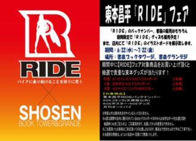 東京の書店・書泉ブックタワー(秋葉原)&グランデ(神保町)にて、本日からRIDEフェアを開催中です。バックナンバーやグッズの販売はじめ、イラストパネルも展示していますので、是非遊びに行ってみてください。さらに、バックナンバーやグッズなど、対象商品をお買い上げいただ...