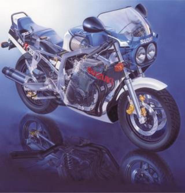 レーサーレプリカのブームに火をつけたのは80年代のスズキでした。まず、83年にフルカウルとアルミフレームを持つRG250Γを世に送り、続いて、84年に400ccのGSX-R400を同じコンセプトで打ち出しました。しかしこれで終わりではありません。ついに彼らは、同じ手法を75...