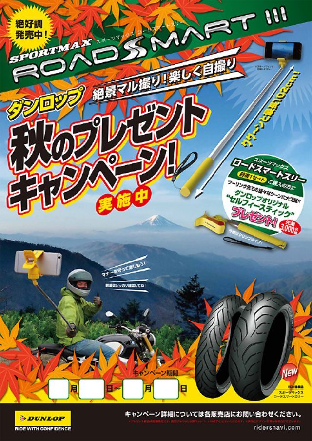 ダンロップが「 楽しく自撮り 秋のプレゼントキャンペーン!」実施ダンロップがバイク用「スポーツマックス・ロードスマートスリー」を前後1セット購入者先着3000名にオリジナル自撮り棒をプレゼントnews.bikebros.co.jp