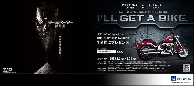 アクサダイレクトがハーレーの当たるキャンペーン実施アクサダイレクトは映画『ターミーネーター:新起動/ジェニシス』とのコラボでHARLEY-DAVIDSON FATBOYや映画特製グッズが当たるキャンペーンを実施news.bikebros.co.jp