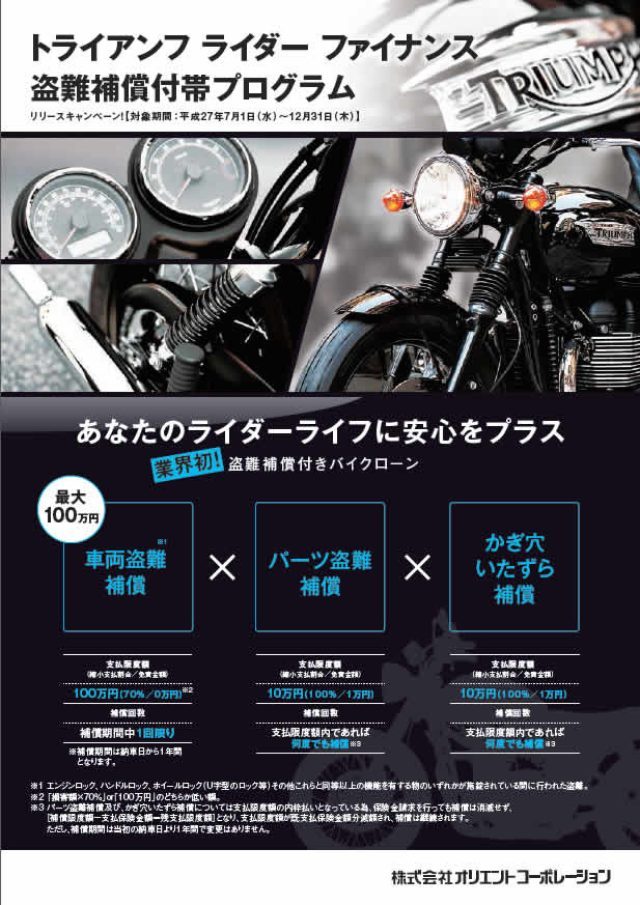 【トライアンフ】業界初の盗難補償付きバイクローンの販売開始トライアンフは業界初の盗難補償付きバイクローン「トライアンフライダーファイナンス盗難補償付帯プログラム」の販売を開始news.bikebros.co.jp