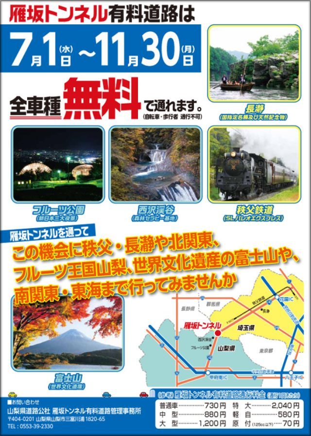 雁坂トンネルの通行料が期間限定で無料に雁坂トンネルの通行料が2015年7月1日から11月30日まで無料となるnews.bikebros.co.jp