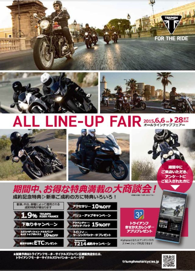 【トライアンフ】6/6から全国の販売店でフェアーを開催トライアンフは2015年6月6日(土)から「ALL LINE-UP FAIR」を実施するnews.bikebros.co.jp