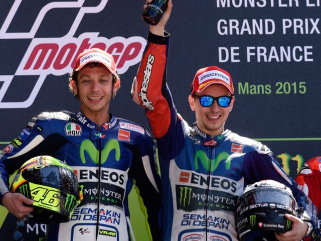 2015年MotoGP第5戦のフランスGP(現地時間2015年5月17日(日))に、ル・マンで開催され、ロレンス、もといロレンソがスペインGPに続いて連勝、ロッシが2位に入り、ヤマハ勢の強さを見せつける結果と終わりました。3位には連続表彰台ゲットを続けるドゥカティのドビツィオーゾ。4位にはホンダの天才児マルケスが入りました。優勝のロレンソ(右)2位のロッシ(左)race.yamaha-motor.co.jp抱き合って喜ぶヤマハコンビrace.yamaha-motor.co.jp1 J・ロレンソ Movistar Yamaha MotoGP Yamaha2 V・ロッシ Movistar Yamaha MotoGP Yamaha3 A・ドビツィオーゾ Ducati Team Ducati4 M・マルケス Repsol Honda Team Honda5 A・イアンノーネ Ducati Team Ducati6 B・スミス Monster Yamaha Tech 3 Yamaha7 P・エスパルガロ Monster Yamaha Tech 3 Yamaha8 Y・ヘルナンデス Pramac Racing Ducati9 M・ビニャーレス Team SUZUKI ECSTAR Suzuki10 D・ペトルッチ Pramac Racing Ducatirace.yamaha-motor.co.jp次回は5月31日のイタリアGPです。現在レーサーランキングではロッシがトップ、2位にロレンソが浮上し、ヤマハが優勢ですが、さてこのまま独走できるでしょうか??