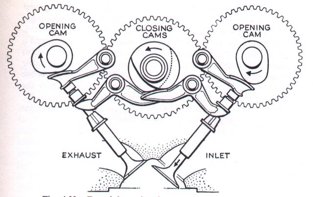 ドゥカティのスポーツモデルに採用されている「デスモドロミック」というメカニズムの名前を、みなさんも何度か聞いたことがあると思います。ドゥカティ=デスモドロミック、というイメージが強いので、ドゥカティが発明したメカニズムと勘違いしている人もいるかもしれませんが、じつはその歴史は古かったりします。1956年のドゥカティ製ロードレーサーに採用されたデスモドロミック機構。バルブ開閉用のカムシャフトが、合計3本あるのが特徴でした。straightspeed.files.wordpress.comひと言でデスモドロミックのメリットを説明すると、4ストロークエンジンの特徴である吸気・排気バルブ用スプリングを省略できる・・・となりますかね? 往復運動するバルブは上下動する時に慣性の力が働きますが、極度に高回転になるとバルブスプリングの追従性がやがて限界に達します。4ストロークDOHCの動弁系の構造図。バルブスプリング(青色)がカムシャフト(上側2本の灰色のパーツ)とともに、吸気・排気バルブの動きを制御します。www.cap-ny153.orgバルブスプリングの材質に、みなさん昔は悩んだのです・・・。大雑把にいうと4ストロークエンジンを高出力にするには、使える回転数を上げることがひとつの手段です(そのほかの高出力化についてはここでは省略)。しかし、これまた大雑把ではありますが、19世紀末〜20世紀初頭の時代のバルブスプリング材は、今の製品よりもはるかに信頼性が低かったのです。それゆえに過度に高回転な設定を狙うと、先述の「追従性」の問題(サージング、破断など)で致命的な故障をすることもあったのです。要するに、バルブスプリングを使わなければ、バルブサージングや破断の問題はありません・・・当たり前のことですけど(笑)。ではバルブスプリングの役割・・・タマゴ形状のような断面のカムに押し下げられた吸気・排気バルブを戻す役割を何に託すか? が問題になるわけですが、これもカムなどでやってしまおうというのが、デスモドロミックの基本的な考え方です。すでに19世紀末に、デスモのアイデアは存在していた。さまざまなデスモドロミックの例。www.italian.sakura.ne.jp日本語版ウィキペディアのデスモドロミックの項には、デスモドロミックの発明は1912年のプジョー(フランス)・・・なんて書いてますが、19世紀末にはダイムラーベンツなどが特許を出願しておりました。フランスのプジョーやドラージュ、イギリスのJAPなど、20世紀に入ってからいろいろなデスモドロミックが作られましたが、際立った成功を一番最初に残したのは、1954~1955年のF1グランプリで活躍したメルセデス・ベンツのGPカー、W196でした。メルセデス・ベンツW196のデスモドロミック機構。「コの字」バルブステムの形状が特徴です。simanaitissays.files.wordpress.comメルセデス・ベンツW196の透視図。2.5リッター8気筒で、290馬力を発揮。ファン・マニュエル・ファンジオやスターリング・モスがF1で大活躍した名機です。blog.caranddriver.comいよいよ、ドゥカティの出番です!W196がF1で活躍していたそのころ・・・1954年にドゥカティに加入したのがファビオ・タリオーニ技師でした。彼は2輪の世界にデスモドロミックをもたらすことになるのですが、その意義は4輪よりも大きかったと言えるでしょう。4輪に比べれば一般に排気量が小さい2輪車は、高出力化のために高回転化を図る必要性が高いので、当時のバルブスプリングの弱点を排除できるデスモドロミック機構は理想的なメカニズムだったのです。ドゥカティ・デスモドロミックの生みの親、そしてドゥカティVツインの生みの親でもある名エンジニア、ファビオ・タリオーニ。bevelheaven.com1968年型モデルからは、ドゥカティの単気筒量産車にもデスモドロミック機構は採用されるようになり、Vツインの750SSから2気筒車にもデスモドロミックが導入されています。ちなみに、そのほかの2輪メーカーでもデスモドロミックにトライした例はあります。有名なのは英国のノートンでしょう。ファクトリーロードレースチームが解散した1955年以降も、小規模な実験部門はノートン・マンクス単気筒レーサーの研究を進め、1957年にデスモ・バージョンを開発していました。ノートンのデスモドロミック。吸気側・排気側の開閉用カムをそれぞれ独立した軸に置いているのが特徴でした。www.italian.sakura.ne.jpデスモの明日はどっちだ?タリオーニがデスモドロミックを2輪の世界にもたらした当時は、まだまだバルブスプリング材の質が低かった時代でした。それゆえにデスモドロミックの優位性は光りました。高回転まで回してもバルブサージングやバルブスプリング破断がなく追従性に優れる点。特に、過大なエンジンブレーキをかけて回転数が上がったときに、バルブまわりにトラブルが生じにくいことは大きなメリットでした。しかし、時は過ぎて・・・バルブスプリング材の品質は1950年代以前よりもはるかに向上した現在、デスモドロミックの優位性は昔よりもはるかに減って