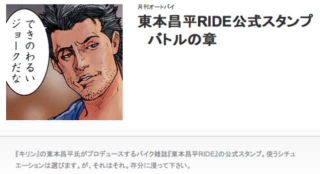 「東本昌平RIDE」のLINE用公式スタンプが発売!月刊オートバイの兄弟誌である「東本昌平RIDE」の、 LINE用公式スタンプが発売開始になりました! 下記のアドレスをクリックするか、 LINEのスタンプショップで「東本昌平RIDE」で検索して頂くと 公式スタンプに辿り着けます。 東本昌平 氏のファンの方も、RIDE誌の読者の方も ぜひチェックしてみてくださいね! スタンプ名:東本昌平RIDE公式スタンプ バトルの章 (120円) ストアURL http://line.me/S/sticker/1110518www.autoby.jp