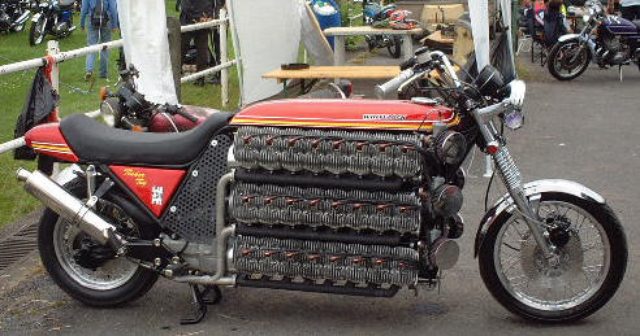 www.bigbikeriders.comなんだこりゃ〜! ビヨ〜ンと延ばされたガソリンタンクの下に納まってる、ひだひだの連続はおそらくエンジンなのでしょう。ボクは焼き鳥屋でも珍味のちょうちん(卵巣)が食べられないという、軽い連続恐怖症(そんな症例があるのかわかりませんが...)なので、驚きを通り越してちょっと気持ち悪いレベル。これはSimon WhitlockさんがカワサキKH250のシリンダーを使って製作した48気筒・4200ccのカスタムバイクです。KH250といえば1969年に発表されて、当時世界最速ともいわれたマッハIIIの末裔のようなバイクですが、250ccながらマッハシリーズの一員として3気筒エンジンを搭載していたので、このマシンは16台分のKH250エンジンを連結していることになります。よく見るとシリンダーは1列あたり8気筒。どうなっているのでしょうか。www.bigbikeriders.comどうやら6つのキャプレターからそれぞれ8つのシリンダーに燃料を供給しているようです。www.bigbikeriders.com点火系も整然と並んでいますが。。。www.bigbikeriders.comご満悦な様子のSimon Whitlockさんはバイクビルダーではなく商店街などの建物を管理している方のようです。それにしてもこの着想と、これを実現する情熱には脱帽するしかありませんね。映像では48個のKHシリンダーが奏でる大合唱を聴くことができます。振動でエアクリーナーが落ちちゃうのはご愛嬌ですね。https://www.youtube.com/embed/6ratfuML9QA?rel=0● Kawasaki 48 Cylinder Runs!
