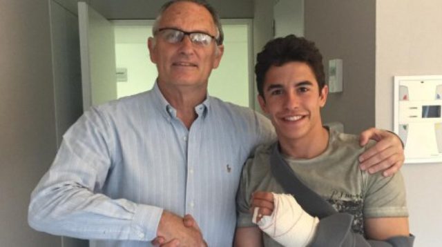 モトGP・HRCのエース、マルク・マルケスが、なんと左手小指を骨折したそうです! 原因はモトクロストレーニング中の転倒とのこと。シーズン中もトレーニングに励まねばならない、トップレーサーゆえのアクシデントでしょうが・・・。病院で左小指の手術を終えたマルケス。今週末のレースは、どうなるのでしょう?photos.motogp.com今週末の5月2日は、マルケスの母国スペインGP(ヘレス)が開催されます。手術ではすぐに指の機能を回復させるためチタンプレートで固定する方法を選択。つまり、スペインGP参加を視野に入れての処置が施されたわけです。手術は成功! 果たして今週末のレースは・・・?ヘレスでも、V.ロッシとの死闘は繰り広げられるのか? 乞うご期待!images.autosport.comしかし、小指はモノを握る時に何気に重要だったりしますから、まったくライディングに影響がない・・・ということはないでしょう。チームメートのダニ・ペドロザも腕の手術で2戦欠場とこのところ不運続きのHRCにとっては、弱り目に祟り目の出来事には違いありません。ポイントリーダーのバレンティーノ・ロッシとは現在30ポイント差・・・。天才マルケスも今が正念場といえるのかもしれません。これからもシーズンを盛り上げてもらうため、ハンデをはねのける快走をヘレスで披露してくれることを期待しましょう!