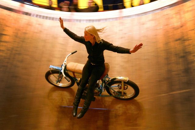 皆さんは「ウォール・オブ・デス」というアトラクションをご存知ですか? モータードロームとも呼ばれるこのショー・・・1980年代の日本のレコード会社なら、「地獄のデス・ライダー」という邦題をつけるのかもしれません?が、そんなにおどろおどろしいものではなく、遊園地やサーカスのアトラクションのひとつです。横座り、ノーハンドという曲芸を披露するケリさん。お見事death!www.fstoppress.com地域のジョブセンターで見つけた仕事!?木製の巨大なバレルの内側・・・のような設備のなかで、モーターサイクルやカート、ミゼットカーなどをグルグル走らせ、遠心力により壁面に張り付いて曲芸走法を披露する・・・この「ウォール・オブ・デス」の歴史は古く、1911年にはニューヨークのコニーアイランドパークで行われていたそうです。その後すぐに移動式の設備が完成し、巡業方式で各地で開催されるようになったとか。バレル状の走路を、観客の人たちは上から見下ろすことになります。www.fstoppress.com女性の「ウォール・オブ・デス」ライダーは非常に珍しい存在です。英国の一流新聞、デイリーメールによると、ケリ・キャメロンさんは、地元のジョブセンターに乗馬の仕事を探しに行ったら、このアトラクションの求人がなぜかヒット・・・。笑顔がステキなケリさんdeath! (BABY METAL風紹介?)c2.staticflickr.com日本にはいないと思うのdeath!?(未確認情報)馬に乗ってスタントする仕事かな・・・と思って職場に行ったら、なぜか馬の姿はなし・・・。馬の代わりにいるのはモーターサイクル・・・しかも壁に張り付いでグルグル回っている・・・。「いやぁ〜無理無理ムリムリ、カタツムリっす・・」と言ったか言わなかったかは定かじゃありませんが? ケリさんはすぐに、その場から逃げようと思ったそうです。しかし、厳しいトレーニングを経て、今は立派な女性「地獄のデス・ライダー」のひとりになったケリさん。このアトラクションのスリルの虜になったようです。//www.youtube.com/embed/MuihnZd0x9I?rel=0Kerri Cameron: Wall of Death Rideryoutu.beLook, no hands! The two daredevil women stunt bikers who ride the Wall of Death (and they don't need helmets)It seems an unlikely job for a lady but for Kerri Cameron, 21, (pictured left) and co-rider Jaimi Tyrell, 19, of a Cambridgeshire-based stunt troupe it's all in a day's work.www.dailymail.co.uk相方のジャイミ・タイレルさんとの息のあった妙技の数々を、ビデオでお楽しみください。第二次対戦前に活躍したヘーゼルさん。マシンはインディアンでしょうかね?upload.wikimedia.orgなお記事を書くためにちょっと調べ物をしていたら、女性の「ウォール・オブ・デス」ライダーは昔にもいたみたいですね。上の写真は1920年代に活躍した、ヘーゼル・ワトキンスさんの肖像です。ちなみにデイリーメールの記事によると、2012年当時ケリさんとジャイミさんのおふたりのほか、アメリカにひとり、ドイツにひとりの女性ライダーがいたとか・・・。日本の女性ライダーのみなさん、あなたも挑戦して、日本人初の栄誉を手に入れてみてはいかがdeathか!