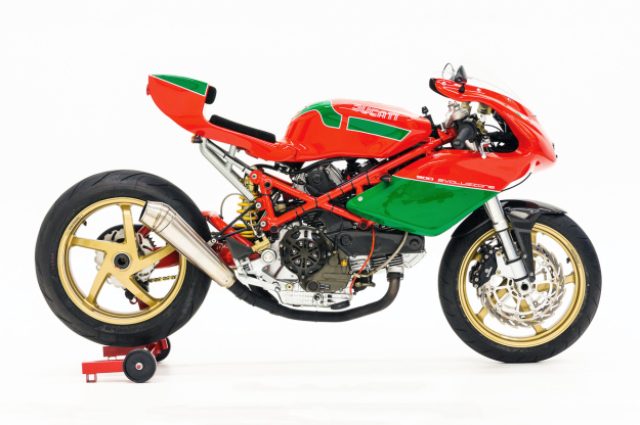 www.bikeexif.com1960年代のロードレース世界選手権で大活躍し「マイク・ザ・バイク」と呼ばれた天才ライダー、マイク・ヘイルウッド。1978年のマン島TTレースで赤と緑に塗りわけられた、ドゥカティを駆って優勝した伝説的なレースを記念して、彼の名を冠して発売されたドゥカティ・マイク・ヘイルウッド・レプリカは、いまも色あせることなくクラシックバイクファンの間で人気の車種となっています。これまでもマイク・ヘイルウッドをイメージしたカスタムドゥカティは数々ありましたが、このカスタムは現代のドゥカティを使ってコンプリートされ、まるでドゥカティから発売された新しいマイク・ヘイルウッド・レプリカであるかのような完成度です。www.bikeexif.comwww.bikeexif.comwww.bikeexif.comこのカスタムレーサーはオランダのFerry van den Boomさんの手により、モジュラー方式とも言えるユニークな方法で車体が構成されています。フューエルインジェクションの900SSのエンジンを、ツーリングモデルのST4のフレームに搭載。足回りにはモンスターS4のショーワ製フロントフォークとモンスターS2Rのスイングアームで、998のマルケジーニ製ホイールを支えています。シャープさが増している900SS風のカウルはオリジナルですが、カウルから流れるように連なるガソリンタンクは999のものです。製作したvan den Boomさんはこのカスタムに対して、マイク・ヘイルウッドのレプリカを作るのが目的ではなかったとおっしゃっているようですが、この赤と緑に塗りわけられたカラーリングはやはりドゥカティ好きには特別なものがありますね。近年のカフェカスタムではクラシックなスタイルが多く見られますが、このカスタムのように「最新」をセンスよくコンプリートしたカフェレーサーもやはりいいものですね。
