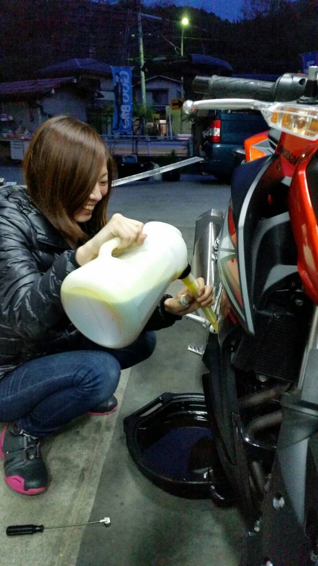 まずは、オイル交換私の愛車kawasaki Z250のオイル交換をしてみよう。ドレンボルトを外してオイルを出します。場所は車体の右側のちょうどスタンドの反対側です。ボルトが外れる直前ぐらいにオイルが出るので、廃油を受ける容器を先に下に置いてから開けた方がいいです。廃油が全部出たら、ドレンボトルを締め、オイルキャップを開けてオイルを入れます。私のZ250はオイル容量が2.4Lなので、2.5Lぐらい用意して、微調整します。今回使ったオイルはMOTUL 300V FACTORY LINEMotoGPやFIM 世界耐久選手権、FIM モトクロス世界選手権、全日本ロードレース選手権や全日本モトクロス選手権など、国内外の最高峰のコンペティションに参戦するファクトリー・チームとのパートナーシップにより培った経験とノウハウから生まれた、エステルを核(コア)としたMOTUL独創の革新的なベースオイルの配合技術であるESTER Core®(エステル・コア) テクノロジーによって誕生した100%化学合成のバイク用エンジンオイル。それがMOTULのバイク用エンジンオイルのフラッグシップ・モデルである、MOTUL 300V FACTORY LINE シリーズです。MOTUL 300V FACTORY LINE シリーズは、ESTER Core® テクノロジーによって最適化されたベースオイルとバイク専用に開発された添加剤の配合により、従来品と比較した当社試験において最大1.3%の馬力の向上と最大2.5%のトルクの向上を達成すると同時に、信頼性と耐摩耗性を損ねることなく優れたギア保護性能とウエット・クラッチの性能を維持し、バイクにとって理想的なパフォーマンスを実現します。www.motul.com何だか高級で高性能なの入れちゃった(笑)オイルの量の微調整は、バイクを垂直に起こしてこの窓から確認するらしい。窓の左側の2つの印を基準に、バイクの用途とか走り方によって半分ぐらいにするとか、満タンにするとか。私は最近サーキット練習が多いので半分よりちょと上ぐらいにしました。自分の愛車をメンテナンス。きっと愛車の事がもっともっと好きになるので、チャレンジしてみてはいかがでしょうか?