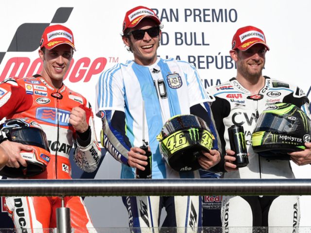 会心の勝利に破顔一笑のロッシ。左は連続表彰台を続けるドゥカティのドビツィオーゾrace.yamaha-motor.co.jp波乱となったアルゼンチンGPポールポジションになったマルケスと、ペドロサの代役で出走中の青山のホンダ勢は、転倒でリタイア。2周目(ラップ)にはサーキットレコードを更新するなど好調な走りをみせていたマルケスですが、ラスト2ラップでなんとロッシと接触して転倒、そのまま無念のリタイアとなりました。これでロッシは三戦連続の表彰台(優勝・3位・優勝)。ランキングトップを堅持しています。また、アンドレア・ドビツィオーソとアンドレア・イアンノーネのドゥカティコンビがランギング2位、3位につけており、今年のドゥカティの安定した強さを見せつけています。アルゼンチンサーキットupload.wikimedia.orgレース結果はこちら■大会名称:MotoGP第3戦アルゼンチンGP■開催日:2015年4月19日(日)決勝結果■開催地:テルマス・デ・リオ・オンド/アルゼンチン(4.806km)■周回数:25周(120.15km)■コースコンディション:ドライ■気温:29度 ■路面温度:36度■観客数:50,234人■PP:M・マルケス (1分37秒802/ホンダ)■FL:V・ロッシ (1分39秒019/ヤマハ)1 V・ロッシ Movistar Yamaha MotoGP Yamaha 41'35.6442 A・ドビツィオーゾ Ducati Team Ducati +5.6853 C・クラッチロー CWM LCR Honda Honda +8.2984 A・イアンノーネ Ducati Team Ducati +8.3525 J・ロレンソ Movistar Yamaha MotoGP Yamaha +10.1926 B・スミス Monster Yamaha Tech 3 Yamaha +19.8767 A・エスパルガロ Team SUZUKI ECSTAR Suzuki +24.3338 P・エスパルガロ Monster Yamaha Tech 3 Yamaha +27.6709 S・レディング Estrella Galicia 0.0 Marc VDS Honda +34.39710 M・ビニャーレス Team SUZUKI ECSTAR Suzuki +34.808race.yamaha-motor.co.jp