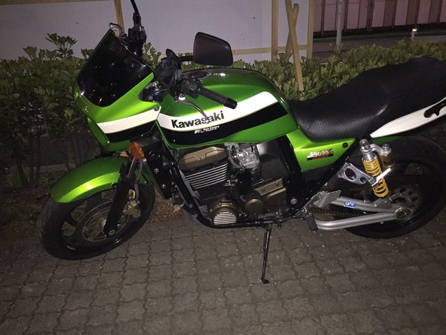 ZRX1200Rは2001年に発売された。エンジンはZRX1100の排気量を1164ccに拡大したもので、 当初の最高出力は100ps/8,000rpmであったが、2004年モデルより平成13年度騒音規制に対応するため低回転域のトルクを重視して95ps/7,500rpmに抑えられた。基本的な車体構造はZRX1100のものを受け継いでいるがフレームとスイングアームを改良し剛性アップが図られ、車体の剛性バランスも見直され操縦性が大きく向上した。2004年にカワサキ正規代理店[ARK]から専用モデルが200台限定で発売された。盗難防止イモビライザーや260km/hフルスケールメーター(リミッター付き)、クロームメッキエキゾーストパイプ・チタンサイレンサー(BEET製NASSERT)が装備され、カラーリングはソリッドなライムグリーンにストライプの専用色が採用された。2006年にも専用色の限定車が発売された。当初はハーフカウルのZRX1200Sも同時に発売されたが、輸出終了を期に生産終了となり日本仕様も終了となった。その後もZRX1200Rはカラーリングが変更されながら販売されていたが、2008年9月の自動車排出ガス規制と輸出の終了により生産終了となった。ja.m.wikipedia.orgDAEGではない、ZRX1200R。なかなかにクールです!