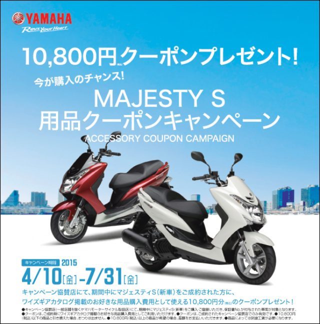 【ヤマハ】マジェスティS購入者向け用品クーポンキャンペーンヤマハは、2015年4月10日から7月31日までの間、マジェスティSの新車購入者にクーポンをプレゼントするキャンペーンを実施するnews.bikebros.co.jp