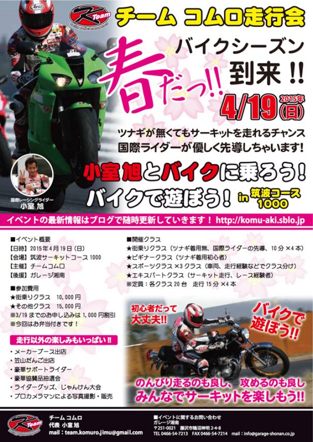 Information「小室旭とバイクに乗ろう! バイクで遊ぼう!!」 - SUPERBIKE.JPwww.superbike.jp4月19日に、筑波サーキットで国際レーシングライダー小室旭さん主催の走行会が開催されます。ツナギ着用無しの街乗りクラスからレース経験者のエキスパートクラスまで細かいクラス分けで筑波サーキットを走行できて、しかも国際ライダーのサポート付き。値段も10,000円~15,000円とリーズナブル!!!サーキットを走ってみたけどツナギが無い!!という初心者の方には是非おススメのイベント(* ́▽`*)是非参加してみてはいかがでしょうか??