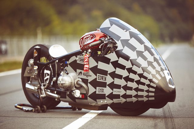 www.ratherberiding.co.zaこれには目を奪われました。何だこれは!と驚かずにはいられないマシンは、フランスのカスタムビルダー「Lucky Cat Garage」によるSprintbeemerと呼ばれるドラッグレーサーです。この特徴的なまさしくロケットというにふさわしいカウルは、1950年代のロードレースで主流だったダストビンカウルを思わせるデザインです。ちなみに「dustbin」とは主に英国で使われるようですが屋外用ゴミ箱の意味だそうです。イギリスではこんな形のゴミ箱があったんでしょうか。よくみるとライダーのヘルメットに招き猫のイラストが、、、ビルダーの名前となっているLucky Cat Garageって招き猫のことなんですね。エンジンはBMW R100のフラットツイン。ドラッグマシンでよく見られるNOSも装備しているようです。大きなダストビンカウルにキャンディレッドの小振りなタンクの組み合わせ。ステアリング周りにはビンテージな雰囲気が見て取れますが、このマシン全体を覆っているのは懐古趣味ではなさそうです。このレトロカスタムにボクは何だかロックを感じてしまいました。古いロカビリー音楽がいきなりサイコビリーになって現代に登場したような。レトロな雰囲気なのに古さを感じさせないSprintbeemerのセンスにはただただ驚かされました。Sonic Séb Takes Another Crack at the SprintbeemerSonic Séb of the Lucky Cat Garage takes his famous Sprintbeemer to the next level.www.ratherberiding.co.za