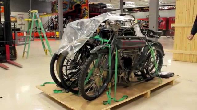 古すぎるんだから〜♪、と歌いたくなるほど古い。クラシックバイクたちを展示しているニューヨークのモーターサイクルペディア博物館に、あらたに6台のバイクが運び込まれます。どれも100年以上前に作られた、古くて美しいバイクたち。さあ、じっくりと堪能してください。クラシックカーもいいけど、始祖鳥を見るような、進化の始まりを覗き込むような、そんな気持ちを味わえますよ。//www.youtube.com/embed/tKcJPt_kE50?rel=0Newest Additions to Motorcyclepedia Museumyoutu.be開梱すると!6台の自転車??いやいやバイクが!108年前のバイク、グリフォンエンブレムも秀麗・・・Parisの文字が次から次へと稀少車が・・これは1902年製チャタリー1903年製 インディアンロマーニア