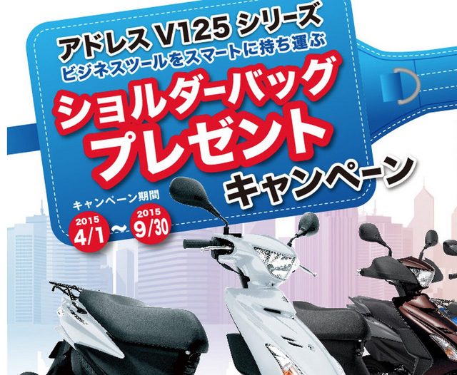 いまアドレスV125シリーズ(もちろん新車)を買うと、特製ショルダーバッグが当たっちゃいます。A4サイズのファイルがちょうどおさまる奥行き9センチのコンパクトなショルダーバッグ。タブレットも入ります。アドレスのロゴも入ります。スズキ国内二輪 アドレスV125シリーズショルダーバッグプレゼントキャンペーンアドレスV125シリーズショルダーバッグプレゼントキャンペーン【キャンペーン期間】2015年4月1(水)〜2015年9月30日(水)期間中、キャンペーン実施店でアドレスV125シリーズ(新車)をご成約のお客様に、「ショルダーバッグ」をプレゼントします!www1.suzuki.co.jp春だし、スクーター通勤もいい感じ。いま購入を考えているなら、候補にいれてみたらいかがでしょう??