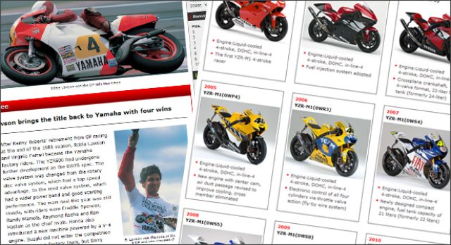 ヤマハのWGP・MotoGP参戦から50周年を記念したスペシャル企画をご紹介します。過去のレースの出場記録や、コラム、壁紙ダウンロード、さまざまなコンテンツが揃っており、ヤマハファンにはたまらない素晴らしいデーターベースになっています。いや、ヤマハファンならずとも、WGP・MotoGPの歴史を振り返るには格好のサイトです。ケニー・ロバーツやエディ・ローソンなどの名レーサーのデータも揃っており、全部見ていくと1日が終わってしまいそうな充実ぶり!この週末の楽しみがまた一つ増えますよ!global.yamaha-motor.comヤマハ(当時・日本楽器製造株式会社)がモーターサイクルの第一号機YA-1を国内市場に投入した1955年は、戦後林立した多数の二輪メーカーによる販売競争がもっとも激しかった時代。YA-1は他社製品と比べて非常に高価なうえ、「楽器屋のポンポン(バイク)はドレミファとでも鳴るのか」と揶揄され、売れ行きは芳しくなかった。そんな状況を知った川上源一社長(当時)は、YA-1の優れた性能と品質を証明すべく、富士登山オートレース全国大会への参加を決断する。1953年に始まったこのレースは、当初、観光客の誘致を目的としたイベントだったが、第2回大会では、販売店へのアピール効果に目をつけたメーカー各社の参加が急増。一気に日本を代表するレースとなっていた。川上社長が参戦を命じたのは、1955年7月10日の第3回大会。だが、開催日までに残された時間は1ヵ月半。その間にYA-1を優勝できるマシンに仕上げなければならない。静岡県の浜名工場で、社運を賭けた戦いが始まった。2台1組ずつ30秒間隔でスタートするタイムトライアル方式のレースに備え、ヤマハは練習の時からスタート、1合目、ゴール(2合目)の3箇所に無線要員を配置してタイムを測り、チーム戦略に役立てた。とはいえ、マシンは市販状態のものに限られており、ほとんど手が出せない。残されたわずかな余地、可能性を求めて手探りの開発である。改造せずにエンジン出力を上げる方法......。考えあぐねたスタッフは、ある時「燃料の質を上げたらどうだ?」と思いつき、航空機用ハイオクガソリンを試してみた。すでに日が沈み、薄暗い中で走行実験を続けていると、誰かが叫んだ。「おい見ろ、赤く光ってないか?」その光は紛れもなく、YA-1のエンジンから発していた。点火プラグの熱価が低かったため、シリンダーヘッド周辺が真っ赤に焼けていたのだ。そんなことの繰り返し。失敗は山と募り、時間ばかりが過ぎていく。「いったどうすればいいんだ...」。口をついて出る言葉は、自分たちの無力さを煽るだけだった。ところが、奇しくもヤマハ発動機が創立した7月1日、開発スタッフに思い掛けない幸運が舞い込んできた。この日届いたDKW社製RT125の新型マフラーをYA-1に装着してテストをしてみると、それだけで0.5馬力パワーが上がったのだ。驚いた技術者たちはすぐにその原因追求に取りかかり、2ストロークエンジンの性能がマフラー形状によって左右される(カデナシー効果)ことを初めて知った。 ようやく見つけた突破口。この日からレースまでの一週間、技術者たちはこれまでに費やした時間を取り戻すかのように、寝る間も惜しんで純正マフラーの改良に全力を注いだ。一方、レースで勝つためには優秀なライダーの育成も必要である。とはいえ、日本楽器の社内にそんな人材がいるはずもない。そこで6月半ば、東京の二輪販売店に相談して10人のライダーを集め、そのまま静岡県富士宮市内で合宿を開始した。レースのスタート地点・浅間神社前からゴールの富士山表口2合目まで、来る日も来る日も、登山道を繰り返し走り続けるハードトレーニングである。工場で使う白い木綿のツナギ服で出場した第3回富士登山レース。革ツナギの存在を知らなかったせいだが、かえって鮮烈印象を残したそのライダーたちを、浜名工場のスタッフも全力でサポートした。毎日レースさながらの走行練習を行うためには、消耗パーツを絶えず補給する必要があったからだ。こうして、限られた時間のなかでともに戦うライダーと開発スタッフは、勝利という目標に向かって結束を固めていった。そして大会当日、YA-1に乗る岡田輝男が、タイムトライアル方式のレースで29分07秒を記録して125ccクラス優勝。さらに3位、4位、6位、8位、9位までYA-1が独占し、その優秀さを全国に知らしめた。これをきっかけに、ヤマハは数々のレースに挑戦。モーターサイクルメーカーとしての基盤を確立していく。global.yamaha-motor.comWGP参戦50年の歩み - バイク レース | ヤマハ発動機株式会社 企業情報ヤマハ発動機のWGP・MotoGP参戦から50周年を記念したスペシャルコンテンツです。50年の歴史をアーカイブやコラムなどによりご紹介します。,[バイク レース]global.yamaha-motor.comレースアーカイブ - バイク レース | ヤマハ発動機株式会社 企業情報ヤマハが過去に参戦してきたレースアーカイブをご覧いただけます。,[バイク レース]global.yamaha-motor.comヒストリー&コ