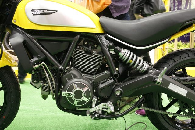 ドゥカティからはやはり話題のスクランブラーでしょう。実車は想像以上にコンパクトで装飾性を排したシンプルな構成がかえって新鮮です。今年のモーターサイクルショーは世界的なカスタムブームの流れを受けているのか、メーカーカスタムの提案も多く見受けられましたが、マシンのみではなくバイクを含めたライフスタイルも合わせて提案したいという、このスクランブラーもドゥカティによるカスタムシーンへのひとつの回答なのではないでしょうか。ハンドル周りはメーター1つのみというこれ以上はないほどのシンプルさです。1970年代のダートトラックレーサーを思わせるティアドロップ型のタンクから、短く切り詰められたシートとテール周りへの流れ。小気味よく跳ね上がったショートマフラー。それぞれの造りを見てゆくと、どこをとってもカスタムの基本的なフォーマットを踏襲しているように感じられます。これはゴツいライディングウエアを脱ぎ捨てて、ファッションにもこだわってオシャレに乗りたいですね。