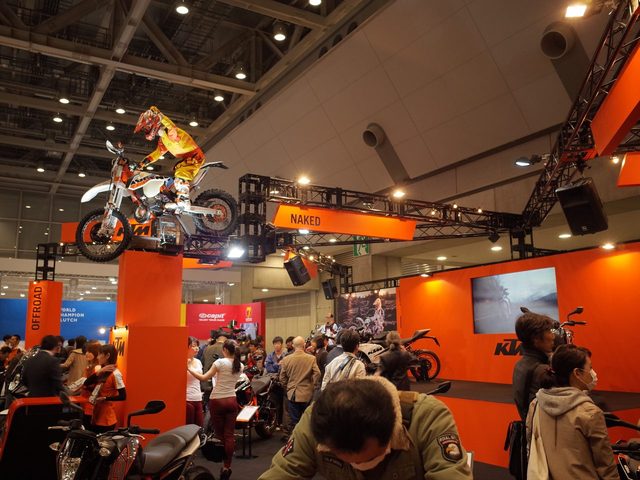 全ブースでもっとも高い位置から!可愛い女の子もスーパースポーツも。KTMのブースは立体感があって、とても楽しい場所でした!オレンジ一色に染まったブースは、元気いっぱい。展示車も華やかで、元気の良さを印象付けてました。これぞモーターサイクルショー!って感じです。