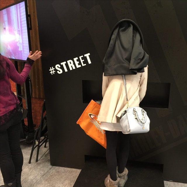 ハーレーダビッドソンのブースの隅にある、ブラックボックスなる怪しげな箱が。その中を覗くと・・・Koda記者がトライ中。横のモニターには、Koda記者が颯爽とストリート750を乗りこなしているではないか!この続きは、後ほど本格的にレポートします!