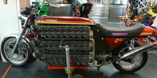 世界ロードレースグランプリの歴史上、最もシリンダー数が多いモデルはモトグッチV型8気筒であることは、こちらの記事でお伝えしました。モータースポーツで気筒数を制限するのは、大雑把にご説明すると多気筒化したほうが高回転化に有利だからです。ゆえにレギュレーションで性能を制限したり、開発費を抑制するために気筒数制限をするわけです。もうほとんどビョーキ by 山本カントクレースに使わなければ、気筒数の制限はないわけですから、何気筒のモーターサイクルを作ってもそれは自由です。でも現実的な問題として、車体サイズ・運動性・販売価格などの要素を考えると6気筒が丁度いい最大数って感じですね。ボスホスみたいに、クルマ用V8エンジンを搭載する荒技もありますけど・・・。なんだか、完成したシリンダーヘッドを並べる、工場内の陳列棚にしか見えません(笑)hertfordshiresuperbikeさて、こちらのモーターサイクルですが、なんと48気筒もあります(笑)。英国のサイモン・ホワイトロックさんが作ったこのモンスター、カワサキKH250の2ストローク3気筒を16台分使った4200ccエンジンを搭載しています。8気筒を6バンクに並べる構成ですが、正確にはもう1気筒を余分に積んでいます(2ストローク50ccで、スターターモーターとして使用)。このギネスブック公認の世界最多気筒車、ちゃんと公道を走れる仕様になっていますが・・・これ公道で乗るんかいっ!とツッコミ待ちのボケにしか思えません(笑)。しかしカスタムの世界は世間の常識、コスト、時間などとは無縁に、純粋に趣味を追求して遊ぶ世界です。その清々しいまでのバカバカしさ(失礼)を、こちらの動画で楽しんでください。https://www.youtube.com/embed/McSikBdGghUHertfordshire Superbike Centre